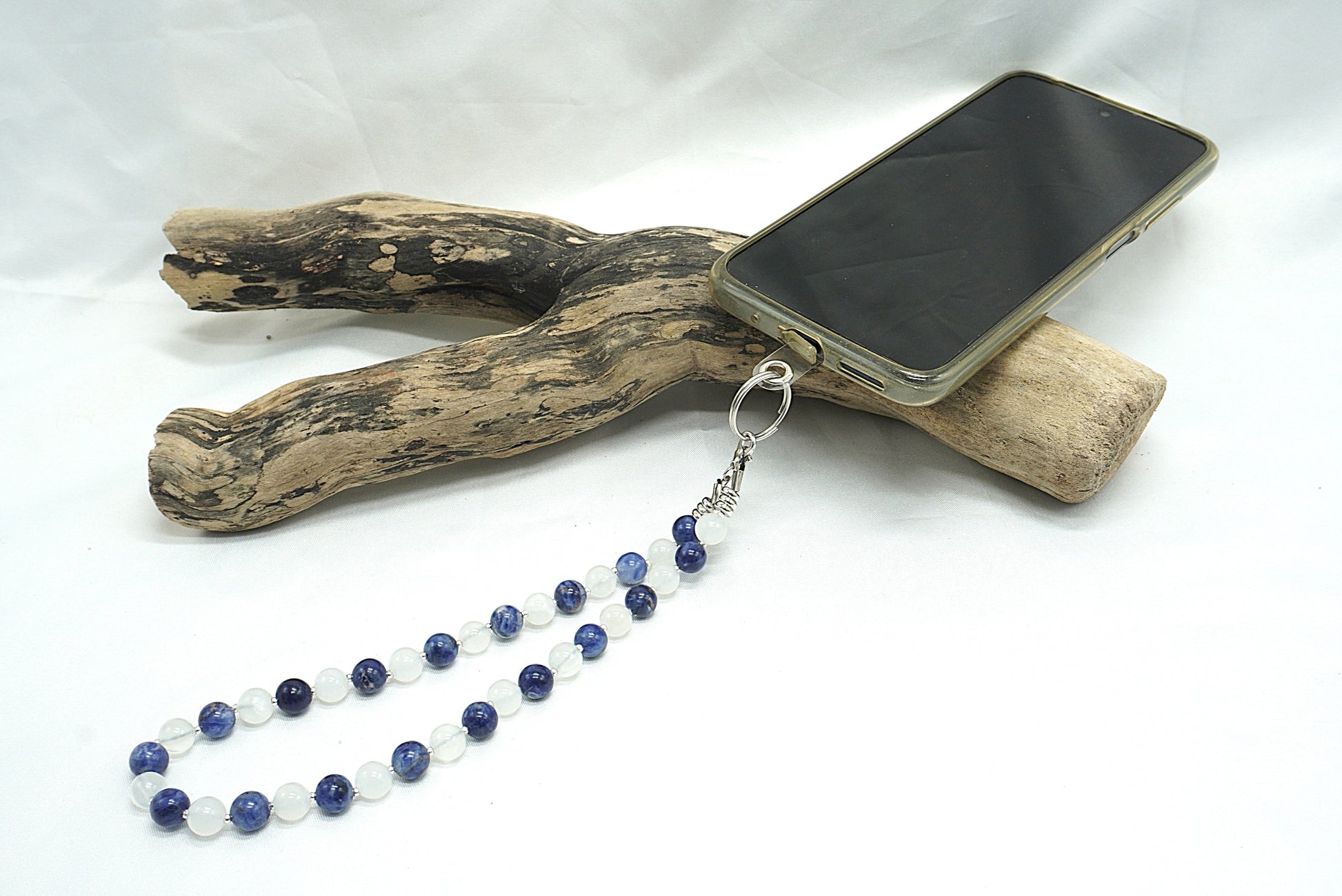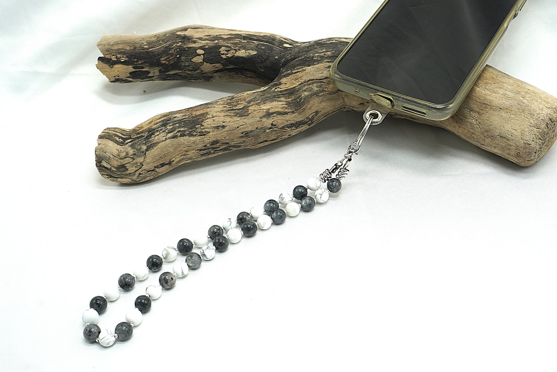 Cordon de téléphone fait main, composé de perles rondes, montées en alternance pour créer un contraste doux et équilibré. L’ensemble dégage une esthétique à la fois épurée et organique, loin des accessoires industriels classiques.
