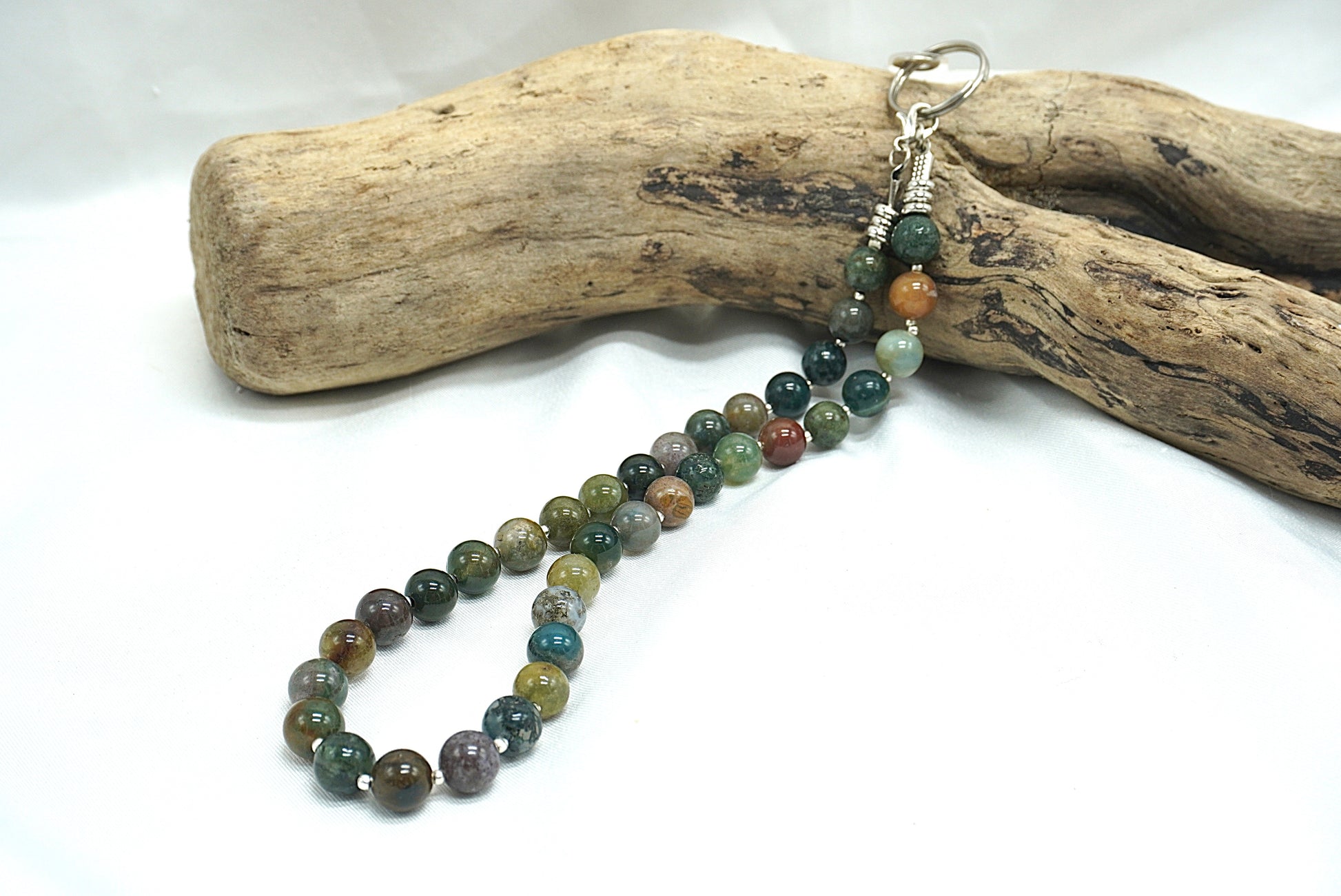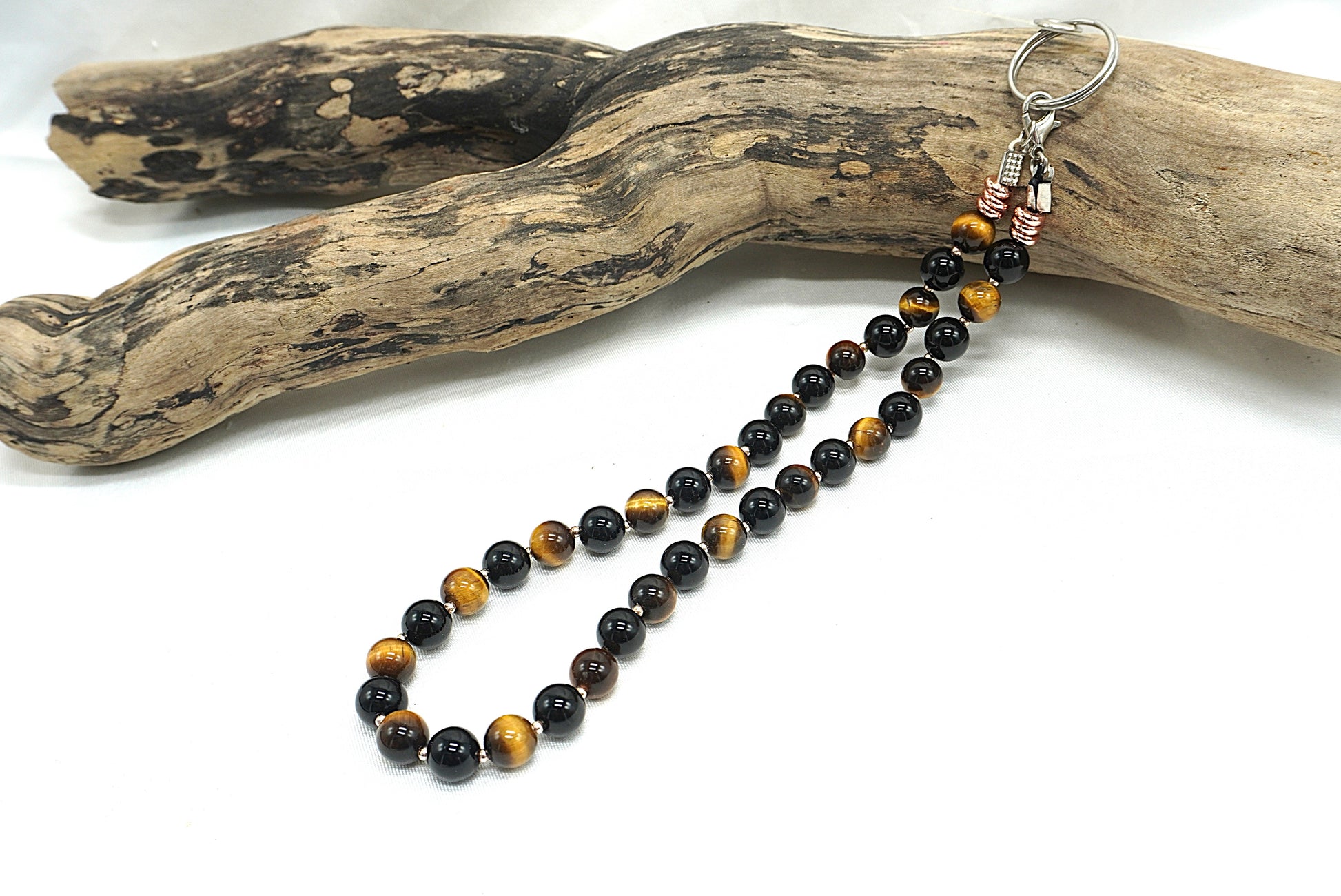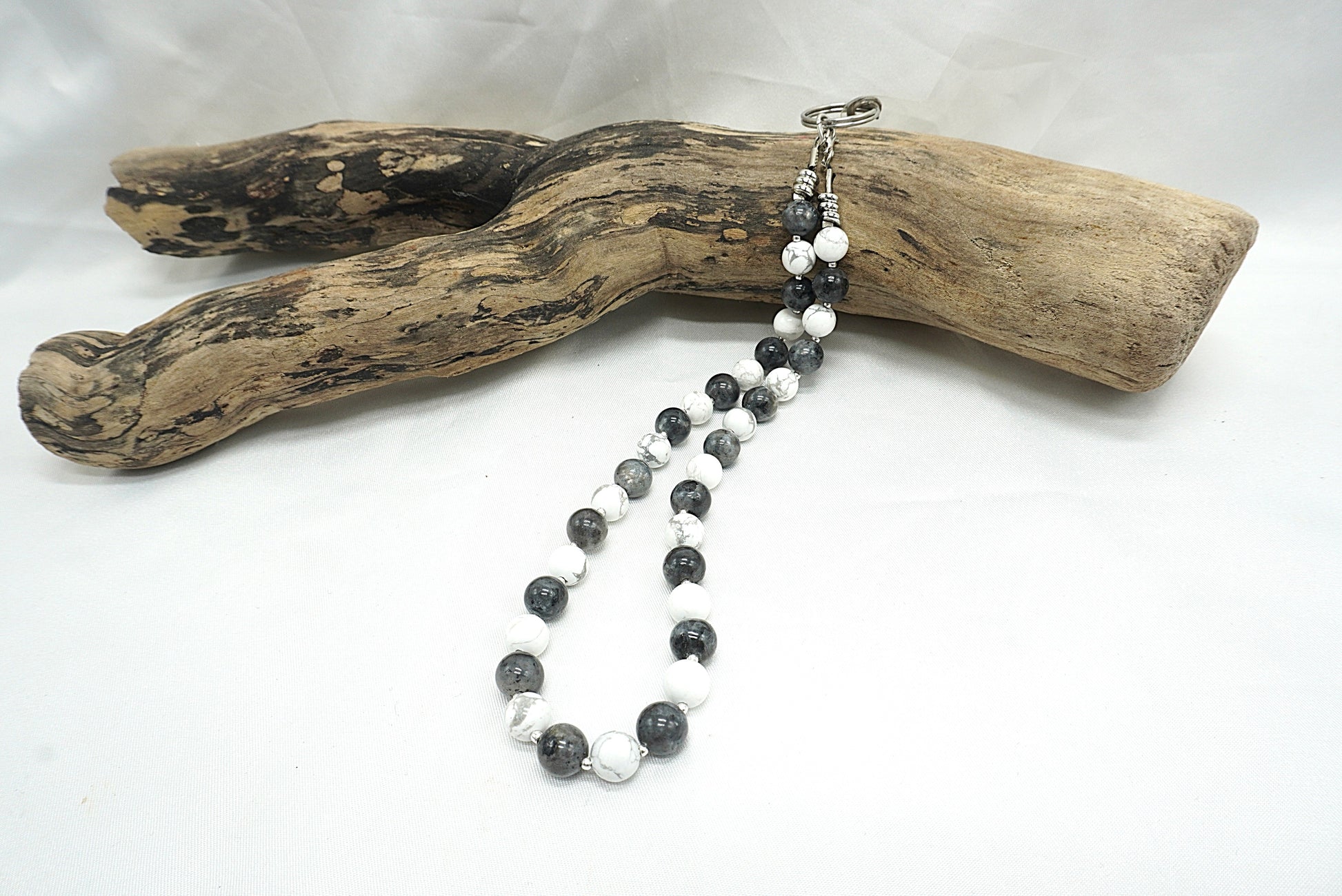 Les perles sont montées sur un fil résistant, avec une attache métallique solide permettant de fixer facilement le cordon au support fourni.