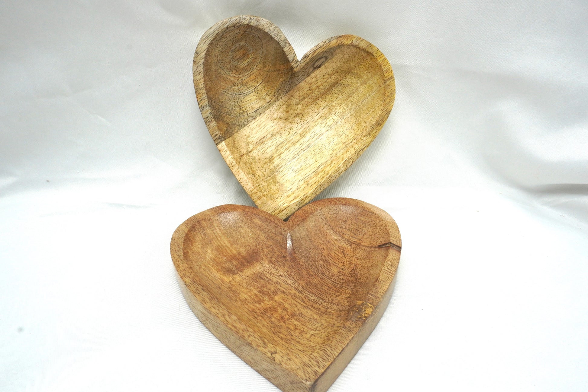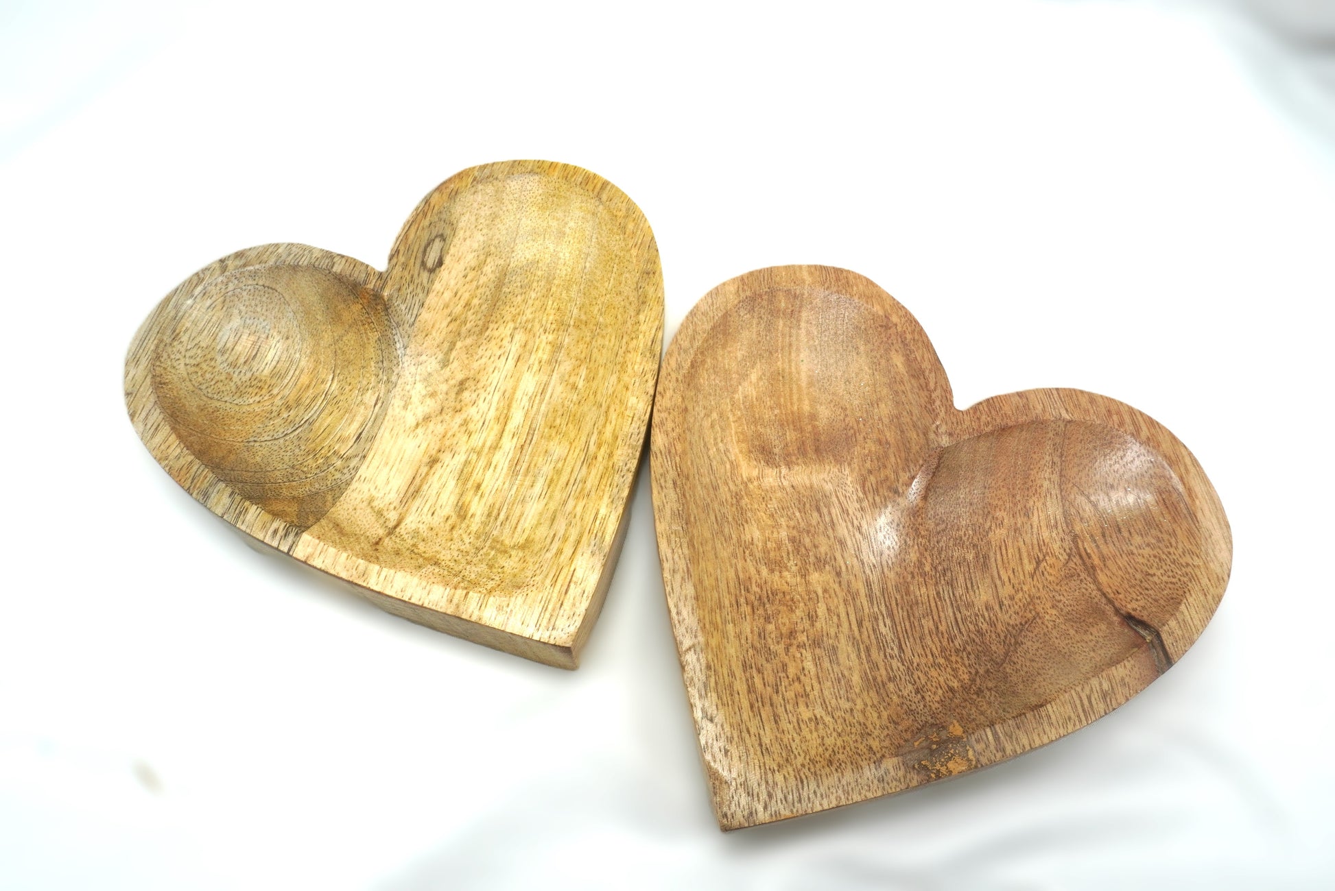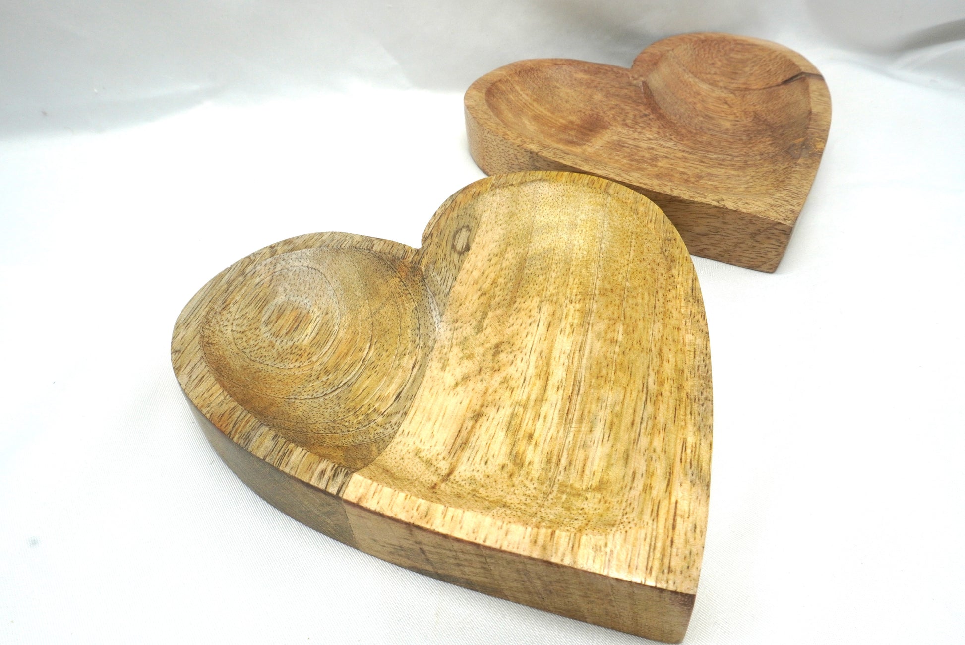 Un petit plateau en forme de cœur en bois de manguier massif, adapté pour ranger des bijoux, des cristaux ou d'autres petits objets.
