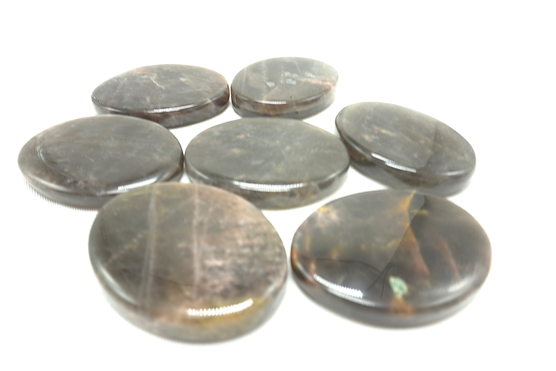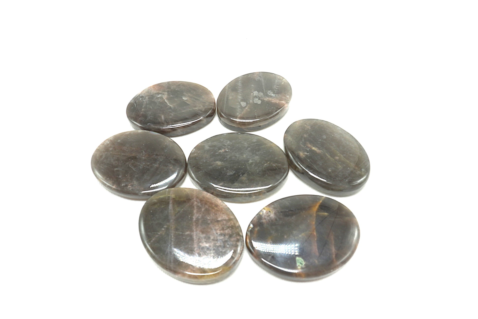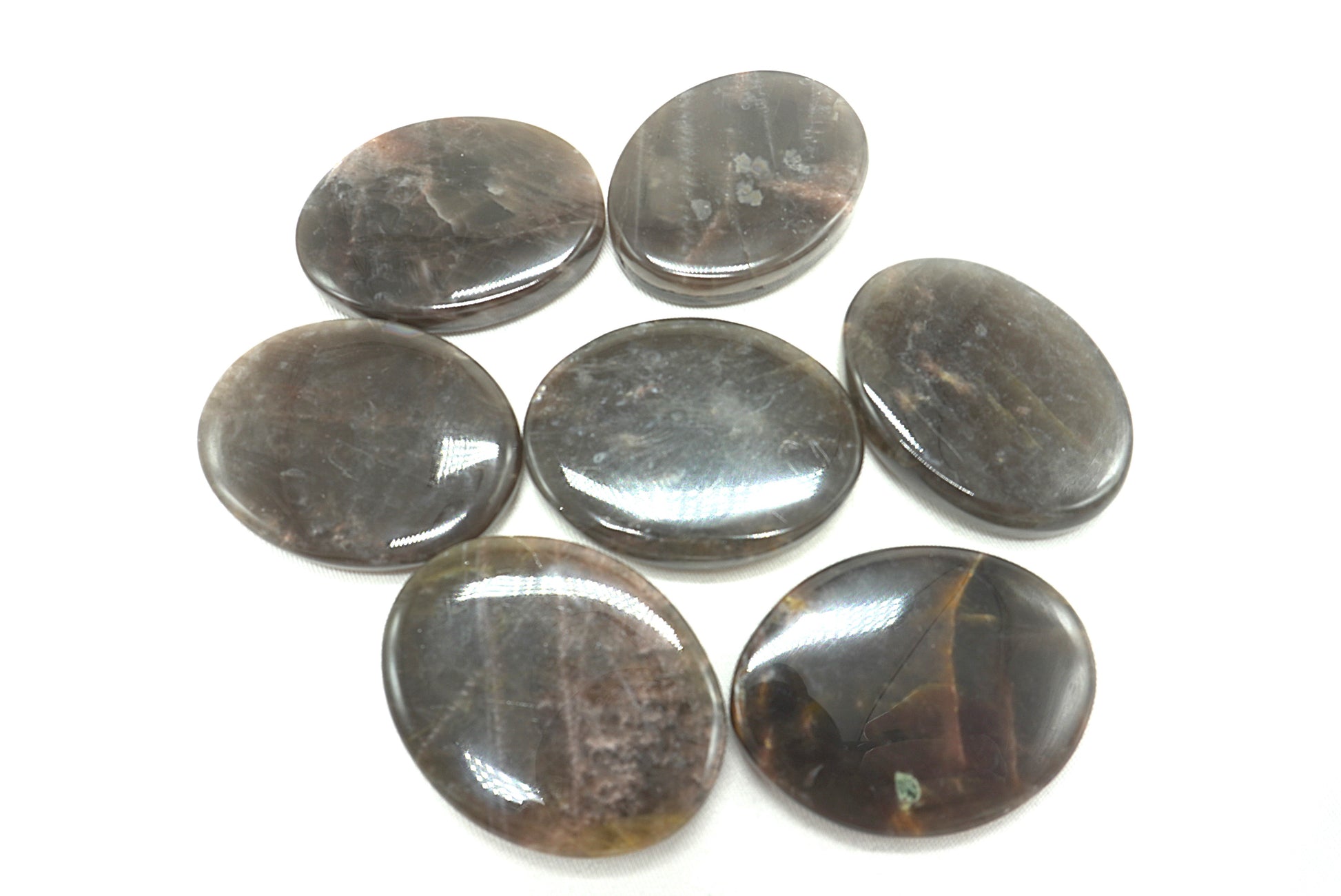 La pierre de lune noire, avec ses reflets bruns, gris fumés ou argentés qui se dévoilent en douceur à la lumière, offre un éclat mystérieux où la nuit se mêle à la clarté lunaire. Reliant la sagesse de la lune à la stabilité de la terre, elle équilibre subtilement les forces de l'intuition et de l'ancrage. Portant en elle les cycles et la profondeur des énergies lunaires, elle agit comme une compagnie de transformation calme mais puissante. Sa lueur douce et tamisée semble inviter à un regard intérieur apaisé, soutenu par une force solide et protectrice.
